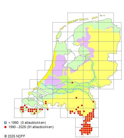 Het aantal atlasblokken (5x5 km) waarin de soort is gemeld binnen een periode van vijf jaar (vanaf 1980) of twintig jaar. Niet gecorrigeerd voor waarnemersinspanning en het aantal doorgegeven waarnemingen kan sterk variëren per periode, dus een trend in verspreiding kan hier niet direct uit worden afgelezen. Het opgegeven jaartal is het eerste jaar van de periode. Bron: gevalideerde waarnemingen uit de NDFF.