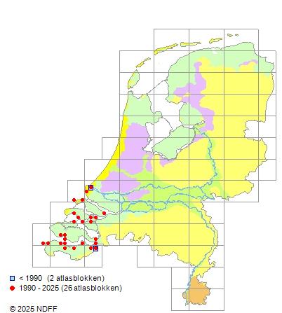 Het aantal atlasblokken (5x5 km) waarin de soort is gemeld binnen een periode van vijf jaar (vanaf 1980) of twintig jaar. Niet gecorrigeerd voor waarnemersinspanning en het aantal doorgegeven waarnemingen kan sterk variëren per periode, dus een trend in verspreiding kan hier niet direct uit worden afgelezen. Het opgegeven jaartal is het eerste jaar van de periode. Bron: gevalideerde waarnemingen uit de NDFF.