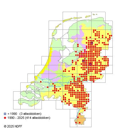 Het aantal atlasblokken (5x5 km) waarin de soort is gemeld binnen een periode van vijf jaar (vanaf 1980) of twintig jaar. Niet gecorrigeerd voor waarnemersinspanning en het aantal doorgegeven waarnemingen kan sterk variëren per periode, dus een trend in verspreiding kan hier niet direct uit worden afgelezen. Het opgegeven jaartal is het eerste jaar van de periode. Bron: gevalideerde waarnemingen uit de NDFF.