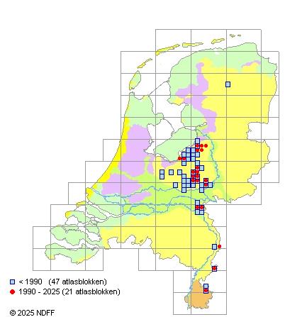 Het aantal atlasblokken (5x5 km) waarin de soort is gemeld binnen een periode van vijf jaar (vanaf 1980) of twintig jaar. Niet gecorrigeerd voor waarnemersinspanning en het aantal doorgegeven waarnemingen kan sterk variëren per periode, dus een trend in verspreiding kan hier niet direct uit worden afgelezen. Het opgegeven jaartal is het eerste jaar van de periode. Bron: gevalideerde waarnemingen uit de NDFF.