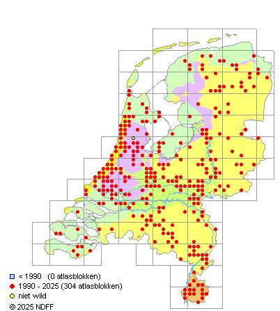 Het aantal atlasblokken (5x5 km) waarin de soort is gemeld binnen een periode van vijf jaar (vanaf 1980) of twintig jaar. Niet gecorrigeerd voor waarnemersinspanning en het aantal doorgegeven waarnemingen kan sterk variëren per periode, dus een trend in verspreiding kan hier niet direct uit worden afgelezen. Het opgegeven jaartal is het eerste jaar van de periode. Bron: gevalideerde waarnemingen uit de NDFF.