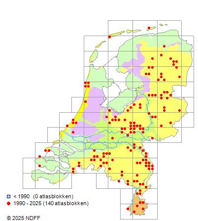 Het aantal atlasblokken (5x5 km) waarin de soort is gemeld binnen een periode van vijf jaar (vanaf 1980) of twintig jaar. Niet gecorrigeerd voor waarnemersinspanning en het aantal doorgegeven waarnemingen kan sterk variëren per periode, dus een trend in verspreiding kan hier niet direct uit worden afgelezen. Het opgegeven jaartal is het eerste jaar van de periode. Bron: gevalideerde waarnemingen uit de NDFF.