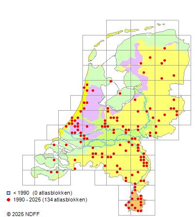 Het aantal atlasblokken (5x5 km) waarin de soort is gemeld binnen een periode van vijf jaar (vanaf 1980) of twintig jaar. Niet gecorrigeerd voor waarnemersinspanning en het aantal doorgegeven waarnemingen kan sterk variëren per periode, dus een trend in verspreiding kan hier niet direct uit worden afgelezen. Het opgegeven jaartal is het eerste jaar van de periode. Bron: gevalideerde waarnemingen uit de NDFF.