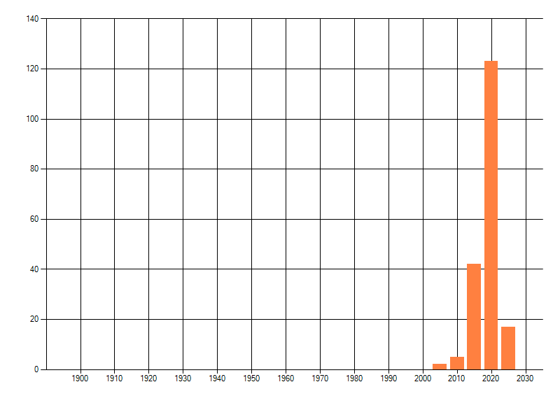 Het aantal atlasblokken (5x5 km) waarin de soort is gemeld binnen een periode van vijf jaar (vanaf 1980) of twintig jaar. Niet gecorrigeerd voor waarnemersinspanning en het aantal doorgegeven waarnemingen kan sterk variëren per periode, dus een trend in verspreiding kan hier niet direct uit worden afgelezen. Het opgegeven jaartal is het eerste jaar van de periode. Bron: gevalideerde waarnemingen uit de NDFF.