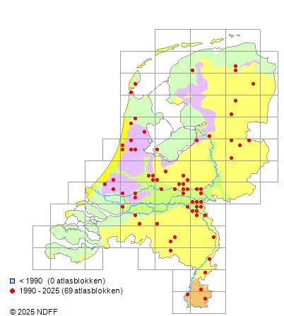 Het aantal atlasblokken (5x5 km) waarin de soort is gemeld binnen een periode van vijf jaar (vanaf 1980) of twintig jaar. Niet gecorrigeerd voor waarnemersinspanning en het aantal doorgegeven waarnemingen kan sterk variëren per periode, dus een trend in verspreiding kan hier niet direct uit worden afgelezen. Het opgegeven jaartal is het eerste jaar van de periode. Bron: gevalideerde waarnemingen uit de NDFF.