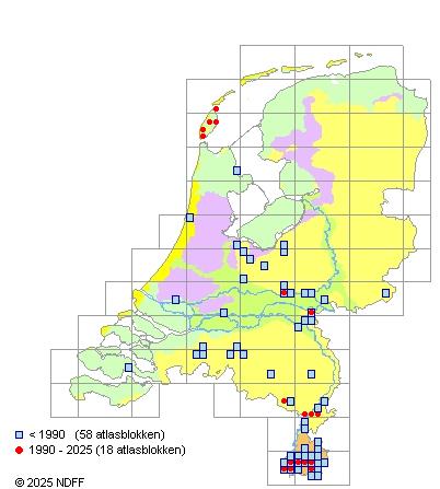 Het aantal atlasblokken (5x5 km) waarin de soort is gemeld binnen een periode van vijf jaar (vanaf 1980) of twintig jaar. Niet gecorrigeerd voor waarnemersinspanning en het aantal doorgegeven waarnemingen kan sterk variëren per periode, dus een trend in verspreiding kan hier niet direct uit worden afgelezen. Het opgegeven jaartal is het eerste jaar van de periode. Bron: gevalideerde waarnemingen uit de NDFF.