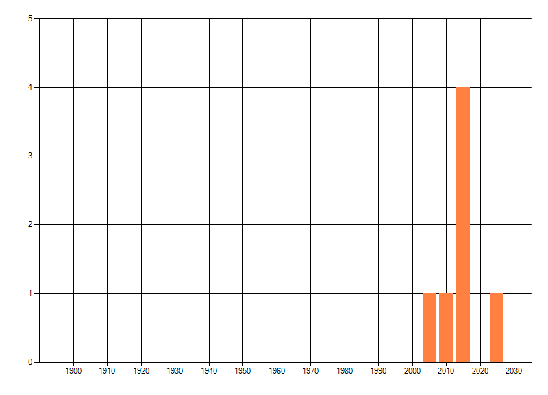 Het aantal atlasblokken (5x5 km) waarin de soort is gemeld binnen een periode van vijf jaar (vanaf 1980) of twintig jaar. Niet gecorrigeerd voor waarnemersinspanning en het aantal doorgegeven waarnemingen kan sterk variëren per periode, dus een trend in verspreiding kan hier niet direct uit worden afgelezen. Het opgegeven jaartal is het eerste jaar van de periode. Bron: gevalideerde waarnemingen uit de NDFF.