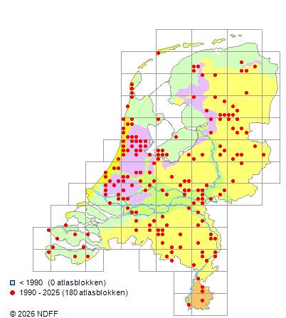 Het aantal atlasblokken (5x5 km) waarin de soort is gemeld binnen een periode van vijf jaar (vanaf 1980) of twintig jaar. Niet gecorrigeerd voor waarnemersinspanning en het aantal doorgegeven waarnemingen kan sterk variëren per periode, dus een trend in verspreiding kan hier niet direct uit worden afgelezen. Het opgegeven jaartal is het eerste jaar van de periode. Bron: gevalideerde waarnemingen uit de NDFF.