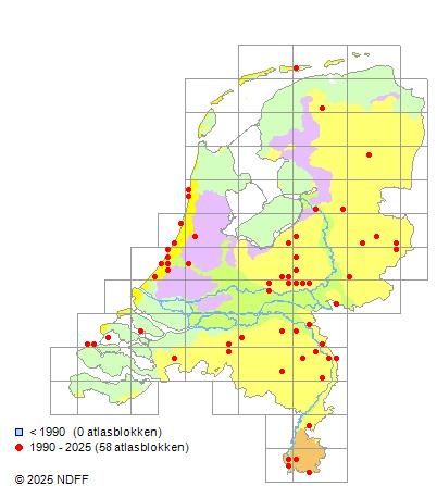 Het aantal atlasblokken (5x5 km) waarin de soort is gemeld binnen een periode van vijf jaar (vanaf 1980) of twintig jaar. Niet gecorrigeerd voor waarnemersinspanning en het aantal doorgegeven waarnemingen kan sterk variëren per periode, dus een trend in verspreiding kan hier niet direct uit worden afgelezen. Het opgegeven jaartal is het eerste jaar van de periode. Bron: gevalideerde waarnemingen uit de NDFF.