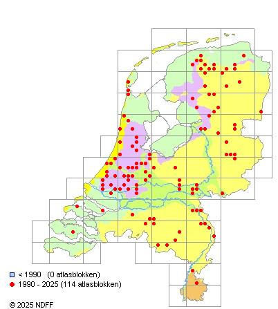 Het aantal atlasblokken (5x5 km) waarin de soort is gemeld binnen een periode van vijf jaar (vanaf 1980) of twintig jaar. Niet gecorrigeerd voor waarnemersinspanning en het aantal doorgegeven waarnemingen kan sterk variëren per periode, dus een trend in verspreiding kan hier niet direct uit worden afgelezen. Het opgegeven jaartal is het eerste jaar van de periode. Bron: gevalideerde waarnemingen uit de NDFF.