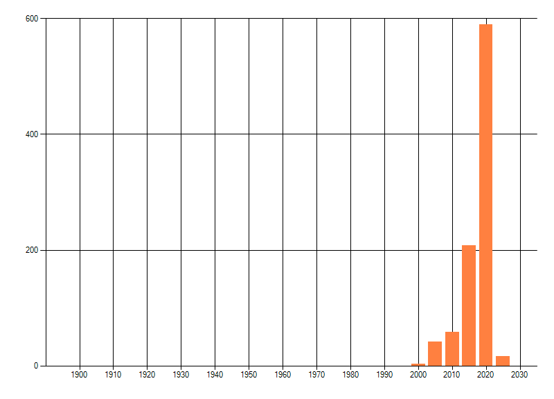 Het aantal atlasblokken (5x5 km) waarin de soort is gemeld binnen een periode van vijf jaar (vanaf 1980) of twintig jaar. Niet gecorrigeerd voor waarnemersinspanning en het aantal doorgegeven waarnemingen kan sterk variëren per periode, dus een trend in verspreiding kan hier niet direct uit worden afgelezen. Het opgegeven jaartal is het eerste jaar van de periode. Bron: gevalideerde waarnemingen uit de NDFF.