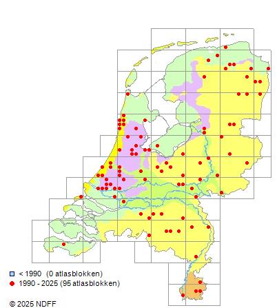 Het aantal atlasblokken (5x5 km) waarin de soort is gemeld binnen een periode van vijf jaar (vanaf 1980) of twintig jaar. Niet gecorrigeerd voor waarnemersinspanning en het aantal doorgegeven waarnemingen kan sterk variëren per periode, dus een trend in verspreiding kan hier niet direct uit worden afgelezen. Het opgegeven jaartal is het eerste jaar van de periode. Bron: gevalideerde waarnemingen uit de NDFF.