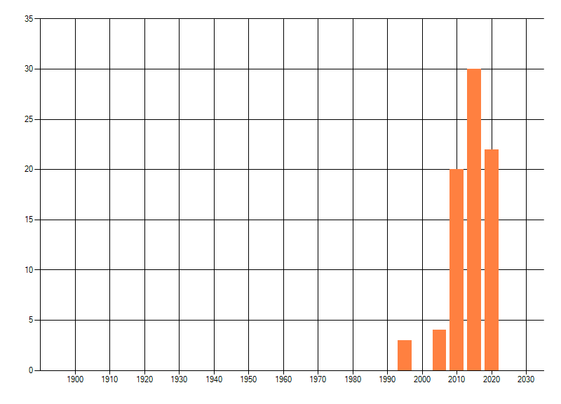 Het aantal atlasblokken (5x5 km) waarin de soort is gemeld binnen een periode van vijf jaar (vanaf 1980) of twintig jaar. Niet gecorrigeerd voor waarnemersinspanning en het aantal doorgegeven waarnemingen kan sterk variëren per periode, dus een trend in verspreiding kan hier niet direct uit worden afgelezen. Het opgegeven jaartal is het eerste jaar van de periode. Bron: gevalideerde waarnemingen uit de NDFF.