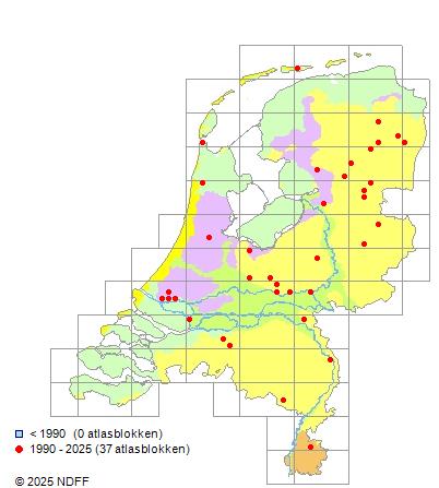 Het aantal atlasblokken (5x5 km) waarin de soort is gemeld binnen een periode van vijf jaar (vanaf 1980) of twintig jaar. Niet gecorrigeerd voor waarnemersinspanning en het aantal doorgegeven waarnemingen kan sterk variëren per periode, dus een trend in verspreiding kan hier niet direct uit worden afgelezen. Het opgegeven jaartal is het eerste jaar van de periode. Bron: gevalideerde waarnemingen uit de NDFF.