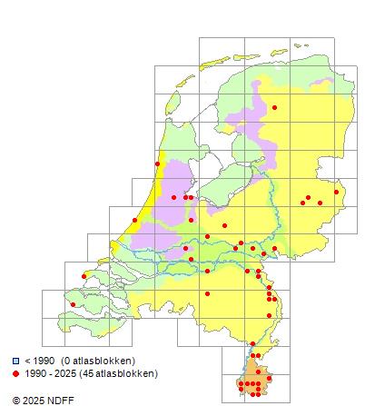 Het aantal atlasblokken (5x5 km) waarin de soort is gemeld binnen een periode van vijf jaar (vanaf 1980) of twintig jaar. Niet gecorrigeerd voor waarnemersinspanning en het aantal doorgegeven waarnemingen kan sterk variëren per periode, dus een trend in verspreiding kan hier niet direct uit worden afgelezen. Het opgegeven jaartal is het eerste jaar van de periode. Bron: gevalideerde waarnemingen uit de NDFF.