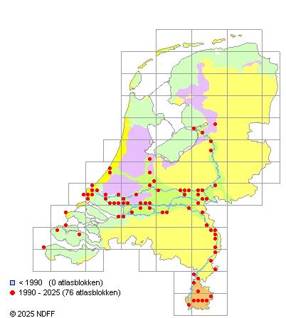Het aantal atlasblokken (5x5 km) waarin de soort is gemeld binnen een periode van vijf jaar (vanaf 1980) of twintig jaar. Niet gecorrigeerd voor waarnemersinspanning en het aantal doorgegeven waarnemingen kan sterk variëren per periode, dus een trend in verspreiding kan hier niet direct uit worden afgelezen. Het opgegeven jaartal is het eerste jaar van de periode. Bron: gevalideerde waarnemingen uit de NDFF.