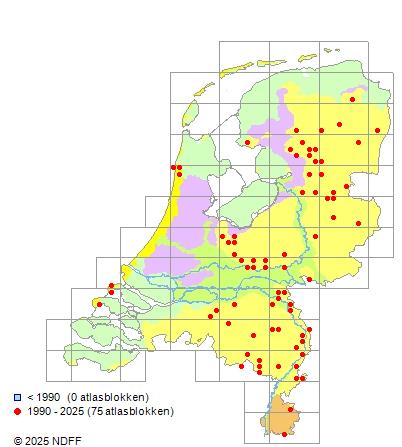 Het aantal atlasblokken (5x5 km) waarin de soort is gemeld binnen een periode van vijf jaar (vanaf 1980) of twintig jaar. Niet gecorrigeerd voor waarnemersinspanning en het aantal doorgegeven waarnemingen kan sterk variëren per periode, dus een trend in verspreiding kan hier niet direct uit worden afgelezen. Het opgegeven jaartal is het eerste jaar van de periode. Bron: gevalideerde waarnemingen uit de NDFF.