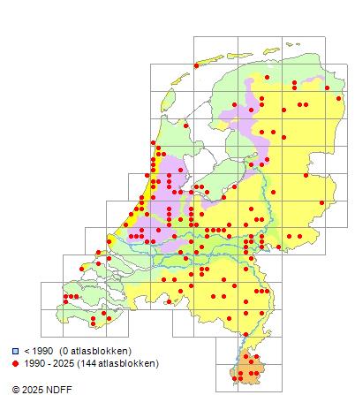 Het aantal atlasblokken (5x5 km) waarin de soort is gemeld binnen een periode van vijf jaar (vanaf 1980) of twintig jaar. Niet gecorrigeerd voor waarnemersinspanning en het aantal doorgegeven waarnemingen kan sterk variëren per periode, dus een trend in verspreiding kan hier niet direct uit worden afgelezen. Het opgegeven jaartal is het eerste jaar van de periode. Bron: gevalideerde waarnemingen uit de NDFF.