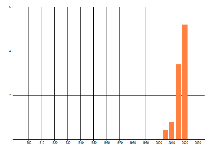 Het aantal atlasblokken (5x5 km) waarin de soort is gemeld binnen een periode van vijf jaar (vanaf 1980) of twintig jaar. Niet gecorrigeerd voor waarnemersinspanning en het aantal doorgegeven waarnemingen kan sterk variëren per periode, dus een trend in verspreiding kan hier niet direct uit worden afgelezen. Het opgegeven jaartal is het eerste jaar van de periode. Bron: gevalideerde waarnemingen uit de NDFF.