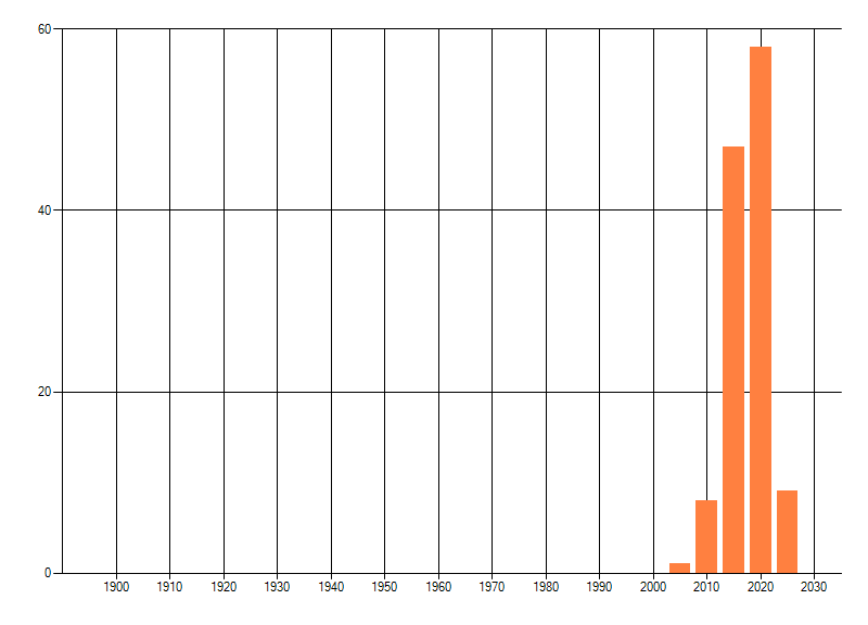Het aantal atlasblokken (5x5 km) waarin de soort is gemeld binnen een periode van vijf jaar (vanaf 1980) of twintig jaar. Niet gecorrigeerd voor waarnemersinspanning en het aantal doorgegeven waarnemingen kan sterk variëren per periode, dus een trend in verspreiding kan hier niet direct uit worden afgelezen. Het opgegeven jaartal is het eerste jaar van de periode. Bron: gevalideerde waarnemingen uit de NDFF.