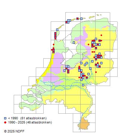 Het aantal atlasblokken (5x5 km) waarin de soort is gemeld binnen een periode van vijf jaar (vanaf 1980) of twintig jaar. Niet gecorrigeerd voor waarnemersinspanning en het aantal doorgegeven waarnemingen kan sterk variëren per periode, dus een trend in verspreiding kan hier niet direct uit worden afgelezen. Het opgegeven jaartal is het eerste jaar van de periode. Bron: gevalideerde waarnemingen uit de NDFF.