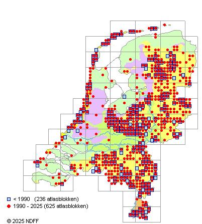 Het aantal atlasblokken (5x5 km) waarin de soort is gemeld binnen een periode van vijf jaar (vanaf 1980) of twintig jaar. Niet gecorrigeerd voor waarnemersinspanning en het aantal doorgegeven waarnemingen kan sterk variëren per periode, dus een trend in verspreiding kan hier niet direct uit worden afgelezen. Het opgegeven jaartal is het eerste jaar van de periode. Bron: gevalideerde waarnemingen uit de NDFF.