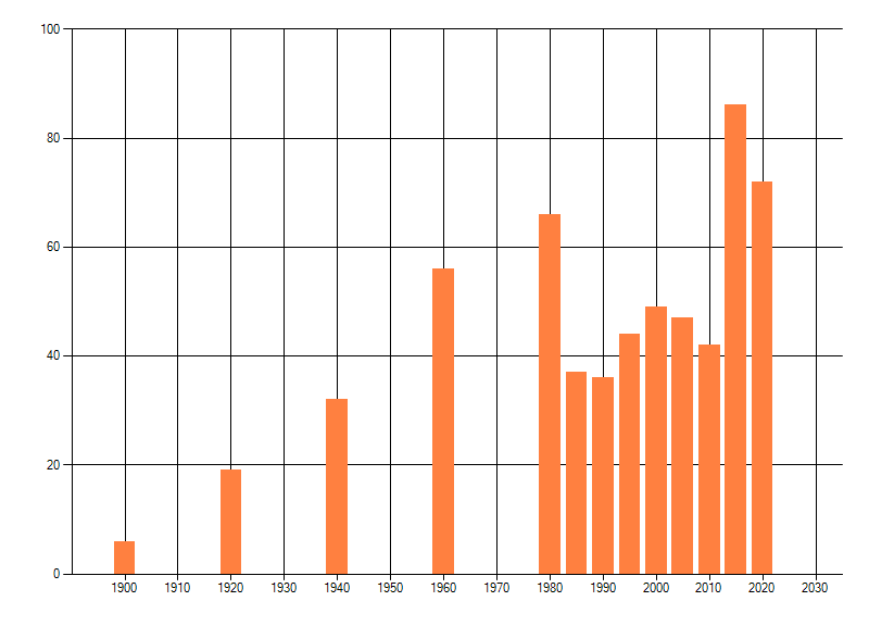 Het aantal atlasblokken (5x5 km) waarin de soort is gemeld binnen een periode van vijf jaar (vanaf 1980) of twintig jaar. Niet gecorrigeerd voor waarnemersinspanning en het aantal doorgegeven waarnemingen kan sterk variëren per periode, dus een trend in verspreiding kan hier niet direct uit worden afgelezen. Het opgegeven jaartal is het eerste jaar van de periode. Bron: gevalideerde waarnemingen uit de NDFF.