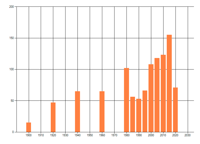 Het aantal atlasblokken (5x5 km) waarin de soort is gemeld binnen een periode van vijf jaar (vanaf 1980) of twintig jaar. Niet gecorrigeerd voor waarnemersinspanning en het aantal doorgegeven waarnemingen kan sterk variëren per periode, dus een trend in verspreiding kan hier niet direct uit worden afgelezen. Het opgegeven jaartal is het eerste jaar van de periode. Bron: gevalideerde waarnemingen uit de NDFF.
