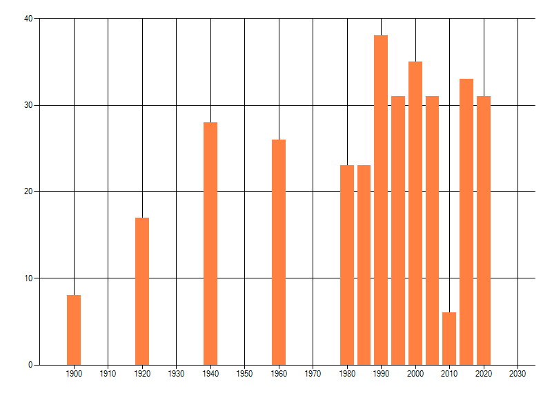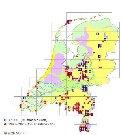 Het aantal atlasblokken (5x5 km) waarin de soort is gemeld binnen een periode van vijf jaar (vanaf 1980) of twintig jaar. Niet gecorrigeerd voor waarnemersinspanning en het aantal doorgegeven waarnemingen kan sterk variëren per periode, dus een trend in verspreiding kan hier niet direct uit worden afgelezen. Het opgegeven jaartal is het eerste jaar van de periode. Bron: gevalideerde waarnemingen uit de NDFF.