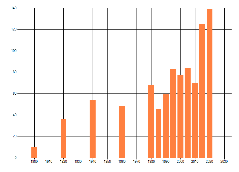 Het aantal atlasblokken (5x5 km) waarin de soort is gemeld binnen een periode van vijf jaar (vanaf 1980) of twintig jaar. Niet gecorrigeerd voor waarnemersinspanning en het aantal doorgegeven waarnemingen kan sterk variëren per periode, dus een trend in verspreiding kan hier niet direct uit worden afgelezen. Het opgegeven jaartal is het eerste jaar van de periode. Bron: gevalideerde waarnemingen uit de NDFF.