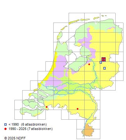 Het aantal atlasblokken (5x5 km) waarin de soort is gemeld binnen een periode van vijf jaar (vanaf 1980) of twintig jaar. Niet gecorrigeerd voor waarnemersinspanning en het aantal doorgegeven waarnemingen kan sterk variëren per periode, dus een trend in verspreiding kan hier niet direct uit worden afgelezen. Het opgegeven jaartal is het eerste jaar van de periode. Bron: gevalideerde waarnemingen uit de NDFF.
