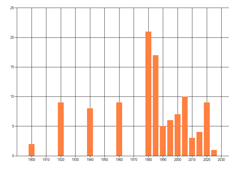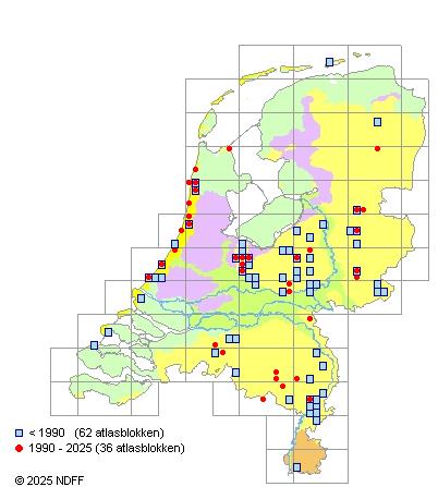 Het aantal atlasblokken (5x5 km) waarin de soort is gemeld binnen een periode van vijf jaar (vanaf 1980) of twintig jaar. Niet gecorrigeerd voor waarnemersinspanning en het aantal doorgegeven waarnemingen kan sterk variëren per periode, dus een trend in verspreiding kan hier niet direct uit worden afgelezen. Het opgegeven jaartal is het eerste jaar van de periode. Bron: gevalideerde waarnemingen uit de NDFF.