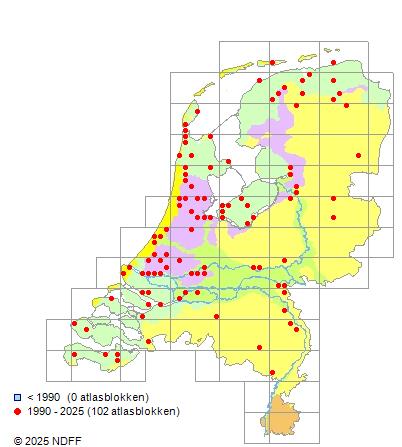 Het aantal atlasblokken (5x5 km) waarin de soort is gemeld binnen een periode van vijf jaar (vanaf 1980) of twintig jaar. Niet gecorrigeerd voor waarnemersinspanning en het aantal doorgegeven waarnemingen kan sterk variëren per periode, dus een trend in verspreiding kan hier niet direct uit worden afgelezen. Het opgegeven jaartal is het eerste jaar van de periode. Bron: gevalideerde waarnemingen uit de NDFF.