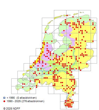 Het aantal atlasblokken (5x5 km) waarin de soort is gemeld binnen een periode van vijf jaar (vanaf 1980) of twintig jaar. Niet gecorrigeerd voor waarnemersinspanning en het aantal doorgegeven waarnemingen kan sterk variëren per periode, dus een trend in verspreiding kan hier niet direct uit worden afgelezen. Het opgegeven jaartal is het eerste jaar van de periode. Bron: gevalideerde waarnemingen uit de NDFF.