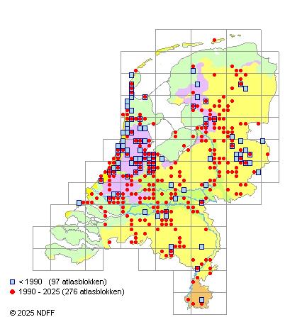 Het aantal atlasblokken (5x5 km) waarin de soort is gemeld binnen een periode van vijf jaar (vanaf 1980) of twintig jaar. Niet gecorrigeerd voor waarnemersinspanning en het aantal doorgegeven waarnemingen kan sterk variëren per periode, dus een trend in verspreiding kan hier niet direct uit worden afgelezen. Het opgegeven jaartal is het eerste jaar van de periode. Bron: gevalideerde waarnemingen uit de NDFF.