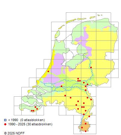 Het aantal atlasblokken (5x5 km) waarin de soort is gemeld binnen een periode van vijf jaar (vanaf 1980) of twintig jaar. Niet gecorrigeerd voor waarnemersinspanning en het aantal doorgegeven waarnemingen kan sterk variëren per periode, dus een trend in verspreiding kan hier niet direct uit worden afgelezen. Het opgegeven jaartal is het eerste jaar van de periode. Bron: gevalideerde waarnemingen uit de NDFF.