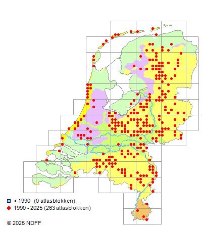 Het aantal atlasblokken (5x5 km) waarin de soort is gemeld binnen een periode van vijf jaar (vanaf 1980) of twintig jaar. Niet gecorrigeerd voor waarnemersinspanning en het aantal doorgegeven waarnemingen kan sterk variëren per periode, dus een trend in verspreiding kan hier niet direct uit worden afgelezen. Het opgegeven jaartal is het eerste jaar van de periode. Bron: gevalideerde waarnemingen uit de NDFF.