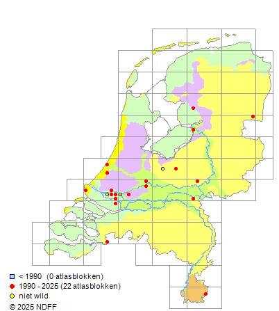 Het aantal atlasblokken (5x5 km) waarin de soort is gemeld binnen een periode van vijf jaar (vanaf 1980) of twintig jaar. Niet gecorrigeerd voor waarnemersinspanning en het aantal doorgegeven waarnemingen kan sterk variëren per periode, dus een trend in verspreiding kan hier niet direct uit worden afgelezen. Het opgegeven jaartal is het eerste jaar van de periode. Bron: gevalideerde waarnemingen uit de NDFF.