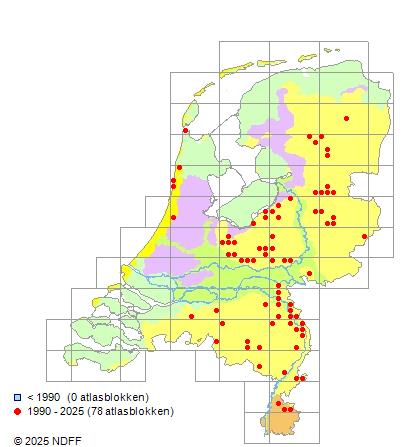 Het aantal atlasblokken (5x5 km) waarin de soort is gemeld binnen een periode van vijf jaar (vanaf 1980) of twintig jaar. Niet gecorrigeerd voor waarnemersinspanning en het aantal doorgegeven waarnemingen kan sterk variëren per periode, dus een trend in verspreiding kan hier niet direct uit worden afgelezen. Het opgegeven jaartal is het eerste jaar van de periode. Bron: gevalideerde waarnemingen uit de NDFF.