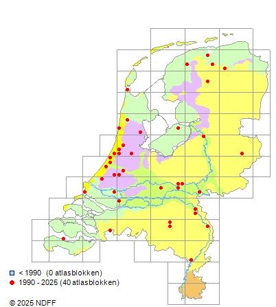 Het aantal atlasblokken (5x5 km) waarin de soort is gemeld binnen een periode van vijf jaar (vanaf 1980) of twintig jaar. Niet gecorrigeerd voor waarnemersinspanning en het aantal doorgegeven waarnemingen kan sterk variëren per periode, dus een trend in verspreiding kan hier niet direct uit worden afgelezen. Het opgegeven jaartal is het eerste jaar van de periode. Bron: gevalideerde waarnemingen uit de NDFF.