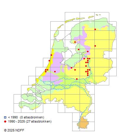 Het aantal atlasblokken (5x5 km) waarin de soort is gemeld binnen een periode van vijf jaar (vanaf 1980) of twintig jaar. Niet gecorrigeerd voor waarnemersinspanning en het aantal doorgegeven waarnemingen kan sterk variëren per periode, dus een trend in verspreiding kan hier niet direct uit worden afgelezen. Het opgegeven jaartal is het eerste jaar van de periode. Bron: gevalideerde waarnemingen uit de NDFF.