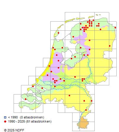 Het aantal atlasblokken (5x5 km) waarin de soort is gemeld binnen een periode van vijf jaar (vanaf 1980) of twintig jaar. Niet gecorrigeerd voor waarnemersinspanning en het aantal doorgegeven waarnemingen kan sterk variëren per periode, dus een trend in verspreiding kan hier niet direct uit worden afgelezen. Het opgegeven jaartal is het eerste jaar van de periode. Bron: gevalideerde waarnemingen uit de NDFF.