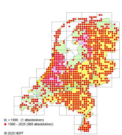 Het aantal atlasblokken (5x5 km) waarin de soort is gemeld binnen een periode van vijf jaar (vanaf 1980) of twintig jaar. Niet gecorrigeerd voor waarnemersinspanning en het aantal doorgegeven waarnemingen kan sterk variëren per periode, dus een trend in verspreiding kan hier niet direct uit worden afgelezen. Het opgegeven jaartal is het eerste jaar van de periode. Bron: gevalideerde waarnemingen uit de NDFF.