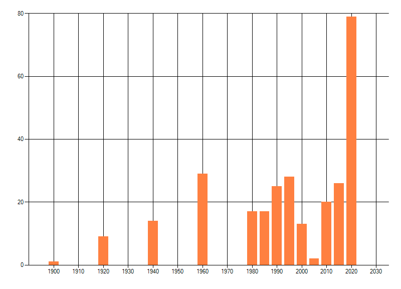 Het aantal atlasblokken (5x5 km) waarin de soort is gemeld binnen een periode van vijf jaar (vanaf 1980) of twintig jaar. Niet gecorrigeerd voor waarnemersinspanning en het aantal doorgegeven waarnemingen kan sterk variëren per periode, dus een trend in verspreiding kan hier niet direct uit worden afgelezen. Het opgegeven jaartal is het eerste jaar van de periode. Bron: gevalideerde waarnemingen uit de NDFF.