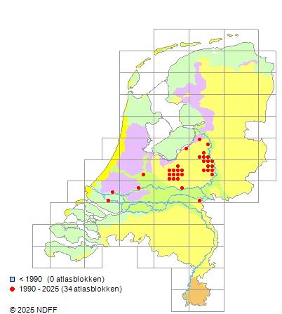 Het aantal atlasblokken (5x5 km) waarin de soort is gemeld binnen een periode van vijf jaar (vanaf 1980) of twintig jaar. Niet gecorrigeerd voor waarnemersinspanning en het aantal doorgegeven waarnemingen kan sterk variëren per periode, dus een trend in verspreiding kan hier niet direct uit worden afgelezen. Het opgegeven jaartal is het eerste jaar van de periode. Bron: gevalideerde waarnemingen uit de NDFF.