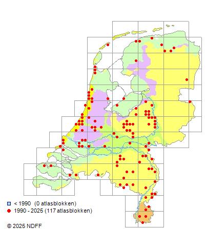 Het aantal atlasblokken (5x5 km) waarin de soort is gemeld binnen een periode van vijf jaar (vanaf 1980) of twintig jaar. Niet gecorrigeerd voor waarnemersinspanning en het aantal doorgegeven waarnemingen kan sterk variëren per periode, dus een trend in verspreiding kan hier niet direct uit worden afgelezen. Het opgegeven jaartal is het eerste jaar van de periode. Bron: gevalideerde waarnemingen uit de NDFF.