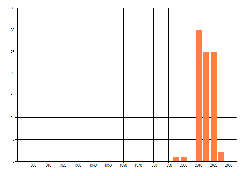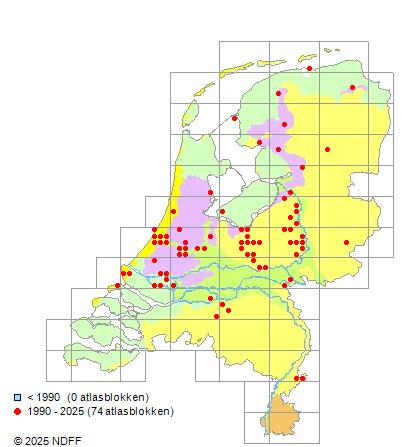 Het aantal atlasblokken (5x5 km) waarin de soort is gemeld binnen een periode van vijf jaar (vanaf 1980) of twintig jaar. Niet gecorrigeerd voor waarnemersinspanning en het aantal doorgegeven waarnemingen kan sterk variëren per periode, dus een trend in verspreiding kan hier niet direct uit worden afgelezen. Het opgegeven jaartal is het eerste jaar van de periode. Bron: gevalideerde waarnemingen uit de NDFF.