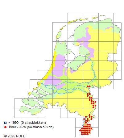 Het aantal atlasblokken (5x5 km) waarin de soort is gemeld binnen een periode van vijf jaar (vanaf 1980) of twintig jaar. Niet gecorrigeerd voor waarnemersinspanning en het aantal doorgegeven waarnemingen kan sterk variëren per periode, dus een trend in verspreiding kan hier niet direct uit worden afgelezen. Het opgegeven jaartal is het eerste jaar van de periode. Bron: gevalideerde waarnemingen uit de NDFF.