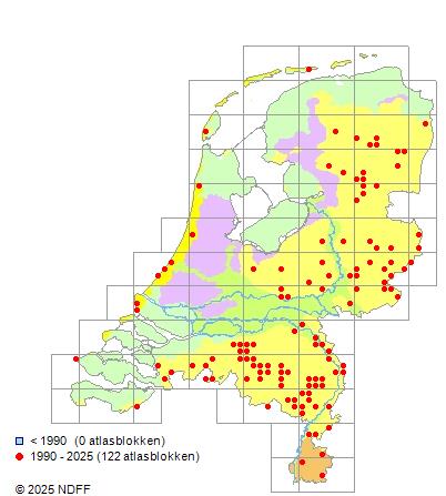 Het aantal atlasblokken (5x5 km) waarin de soort is gemeld binnen een periode van vijf jaar (vanaf 1980) of twintig jaar. Niet gecorrigeerd voor waarnemersinspanning en het aantal doorgegeven waarnemingen kan sterk variëren per periode, dus een trend in verspreiding kan hier niet direct uit worden afgelezen. Het opgegeven jaartal is het eerste jaar van de periode. Bron: gevalideerde waarnemingen uit de NDFF.