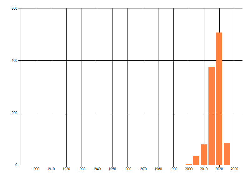 Het aantal atlasblokken (5x5 km) waarin de soort is gemeld binnen een periode van vijf jaar (vanaf 1980) of twintig jaar. Niet gecorrigeerd voor waarnemersinspanning en het aantal doorgegeven waarnemingen kan sterk variëren per periode, dus een trend in verspreiding kan hier niet direct uit worden afgelezen. Het opgegeven jaartal is het eerste jaar van de periode. Bron: gevalideerde waarnemingen uit de NDFF.